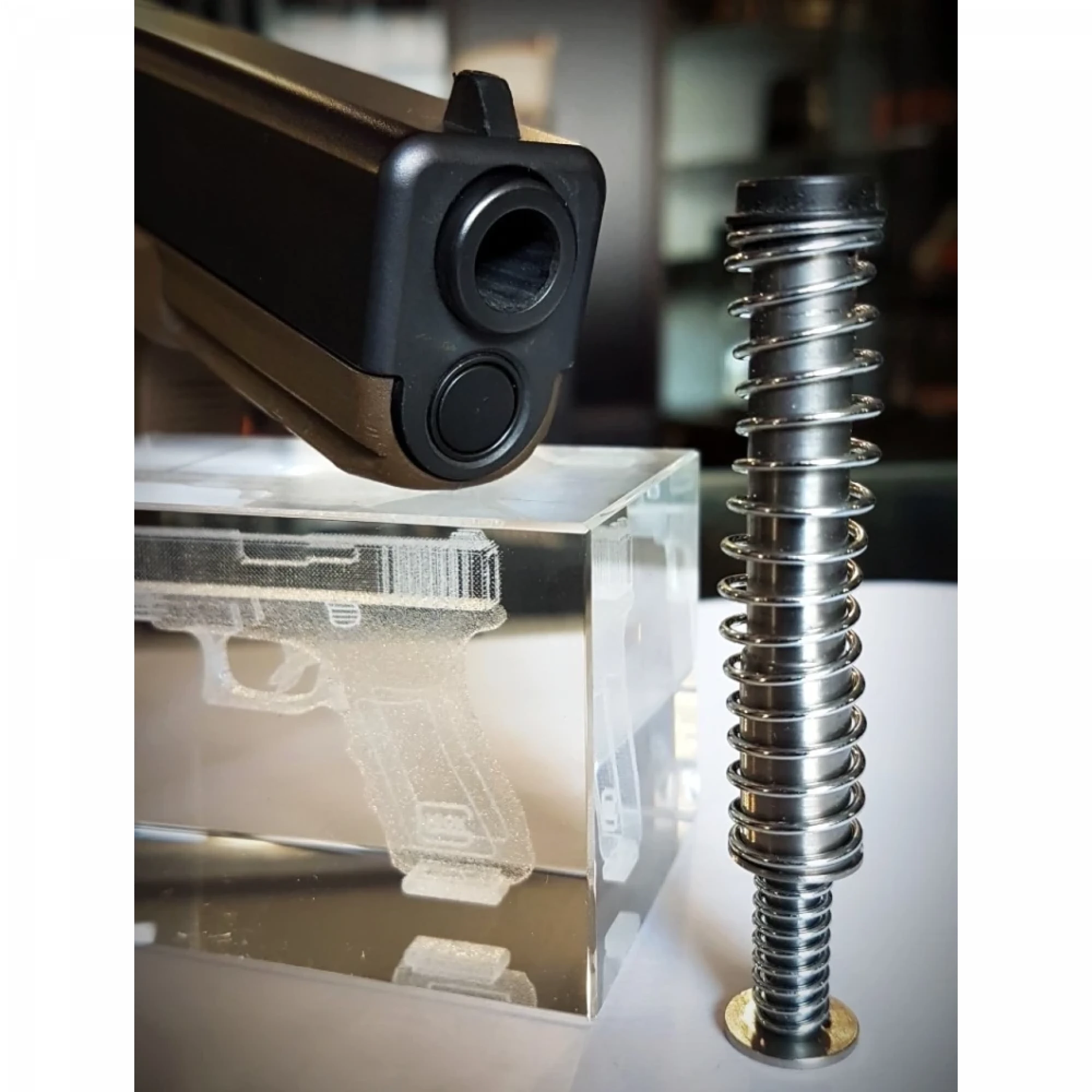 У порівнянні зі стандартною пружиною, вона створює додаткову силу, що гасить жорстке зіткнення затвора з рамкою. Завдяки цьому рух затвора завершується м’якше, що знижує рівень віддачі.